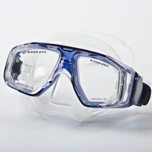 High quality liquid injection silicone in clear.Split silicone mask strap & swivel buckle assembly Dual tempered glass lenses with side windows Designed to fit adults Corrective lenses available; call us toll-free at 888-855-7558 with your prescription.